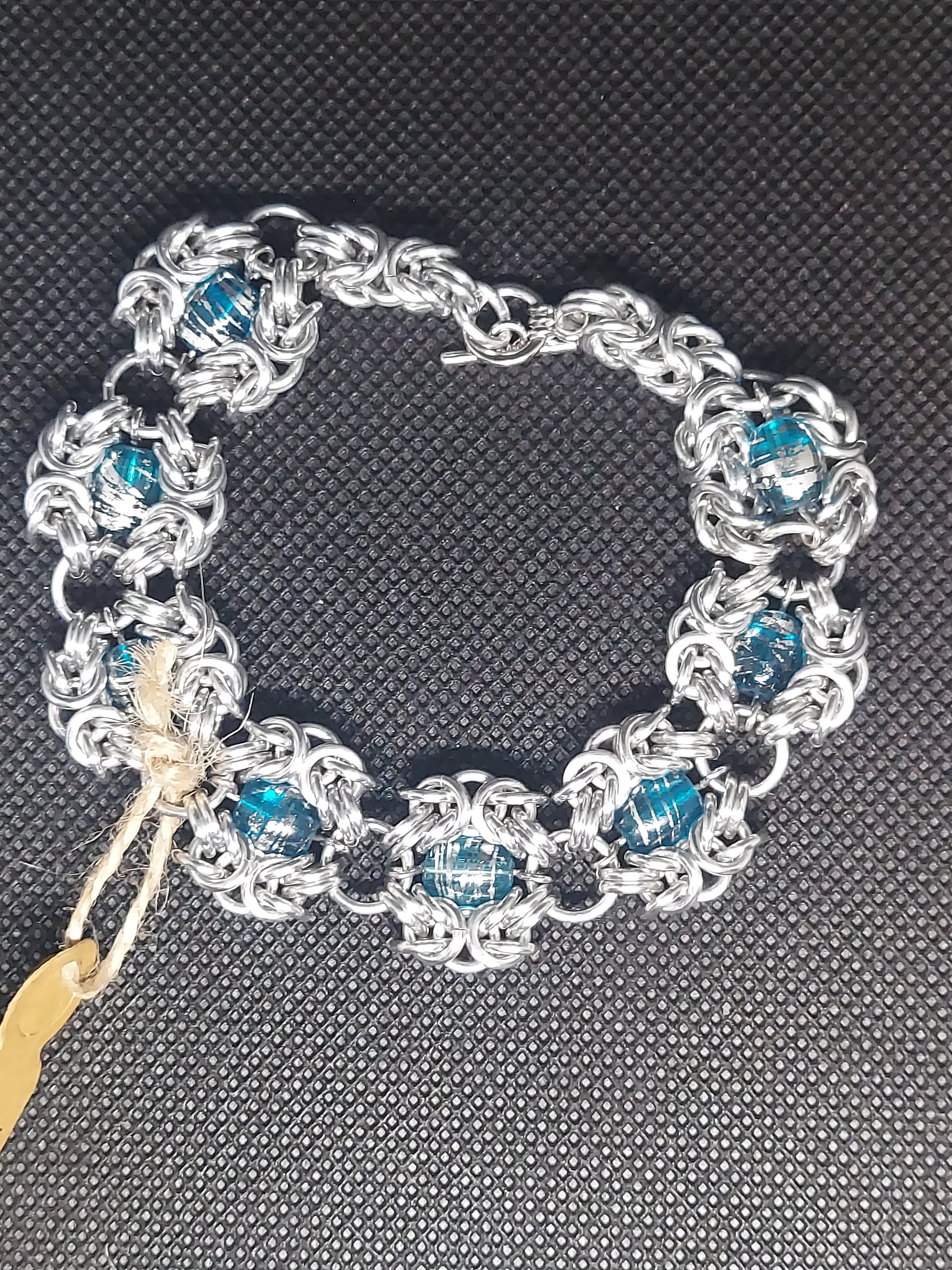 Byzantine weave dragon eye bracelet with aluminum jump rings and glass beads.